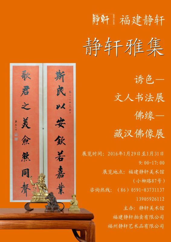 静轩雅集之诱色-文人书法展、佛缘-藏汉佛像展于2016年1月29-31日在福建静轩拍卖有限公司展出(小柳路87号)。